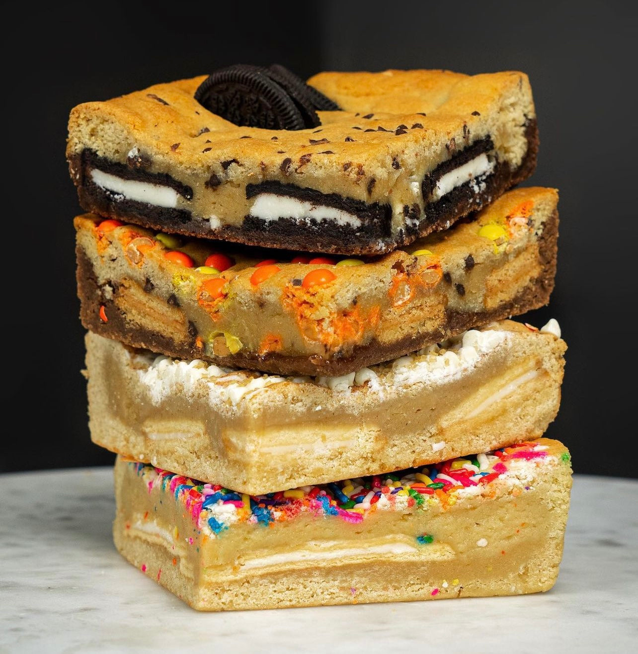 Buttery blondie layered with vanilla creme cookies, topped with snickerdoodle cookie dough, white chocolate chips, cream cheese drizzle, and a sprinkle of turbinado sugar.