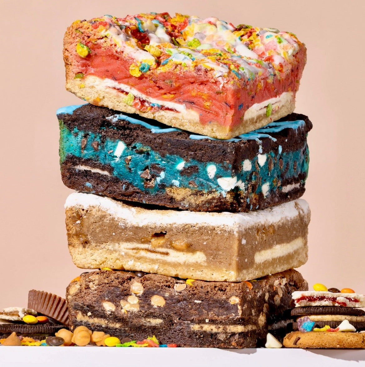 Blondie base, Layered with Brown Sugar poptart, Topped with our Churro Caramel chip cookie dough. Perfected with Vanilla Ganache and Cinnamon Sugar