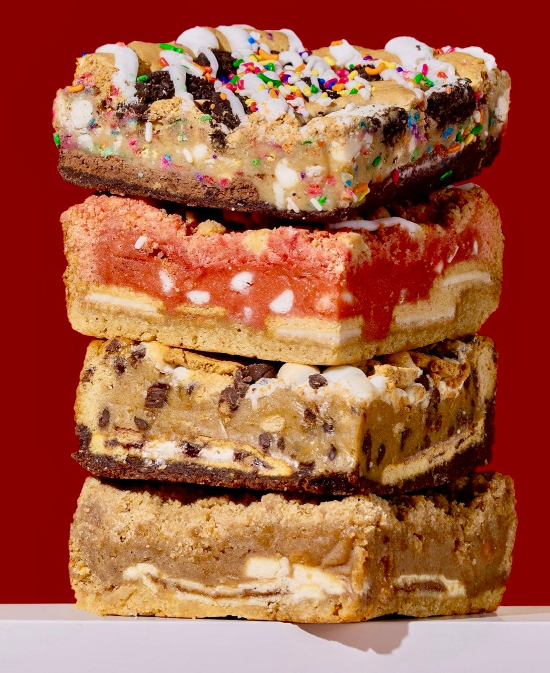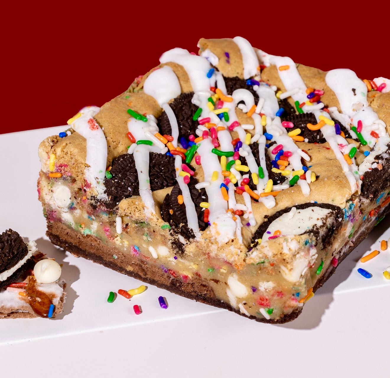 Oreo funfetti brownie layered with a hot fudge sundae poptart and topped with delectable sprinkles and vanilla frosting.