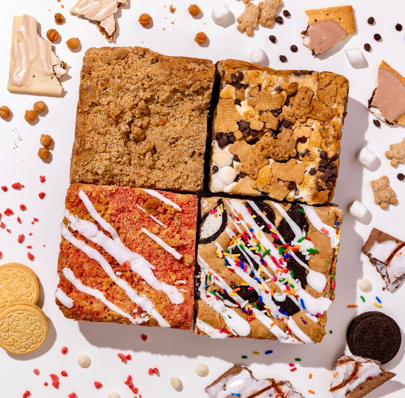 Soft blondie with brown sugar cinnamon poptart, cinnamons streusel cookie dough and our coffee cake crumb topping.