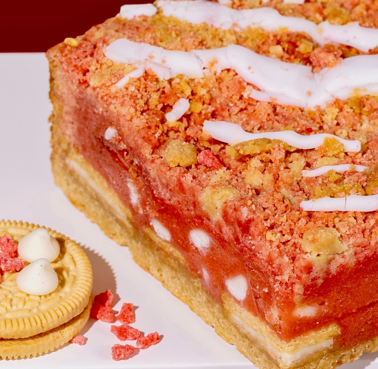 Blondie topped with our strawberries and cream cookie dough. Perfected with our new strawberry crunch topping.