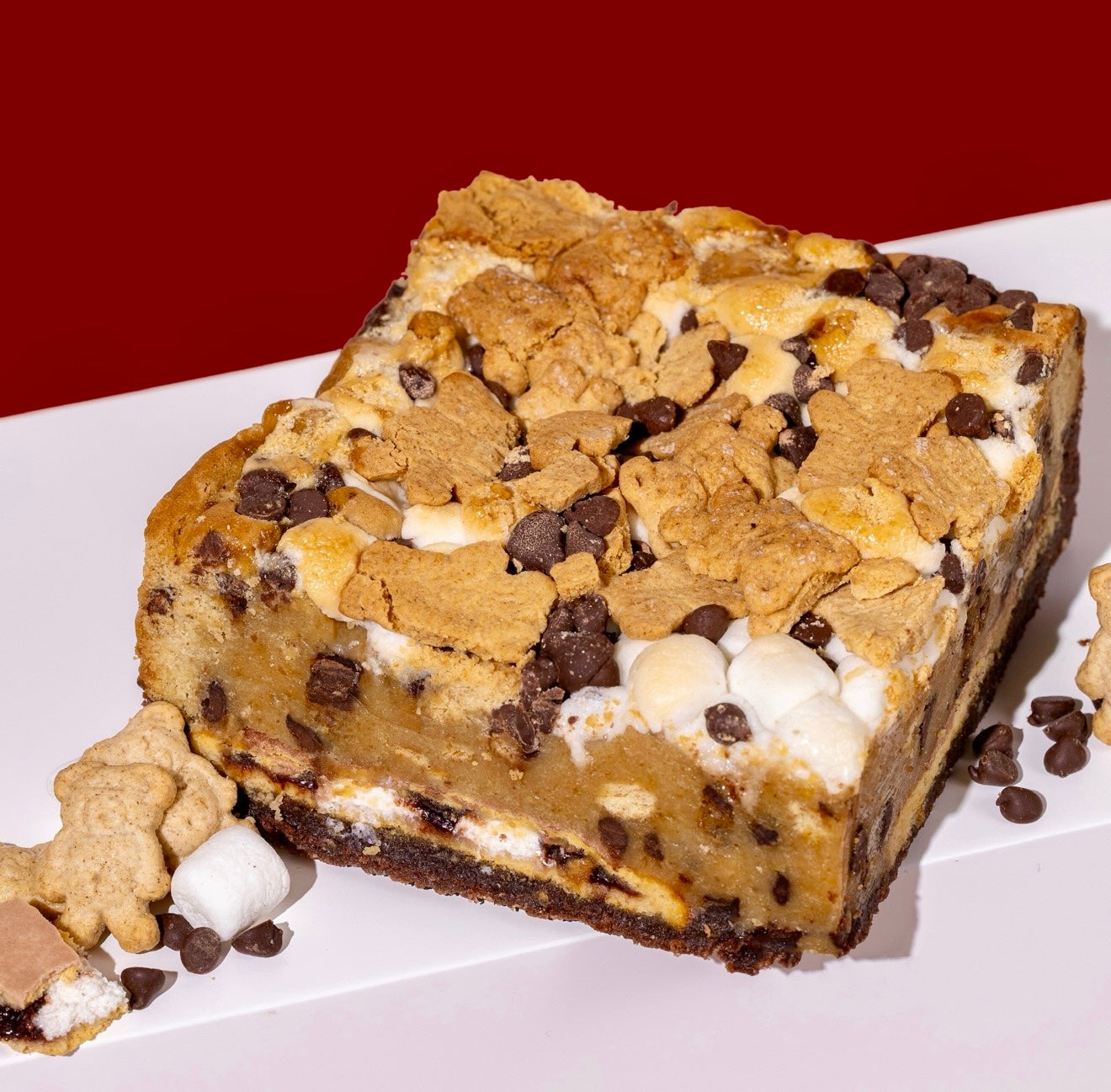 Fudgy brownie loaded with a s’mores poptart and our s’mores cookie dough. Perfected with Mini marshmallows and teddy grahams.